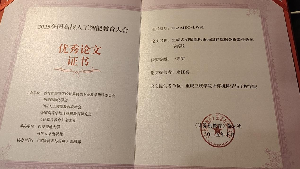 2025年10月17日至19日,全国高校人工智能教育大会在陕西西安召开。9728太阳集团教师余红宴博士参加了此次会议。他撰写的教改论文《生成式AI赋能Python程序设计数据分析教学改革与实践研究》荣获会议论文评比一等奖。