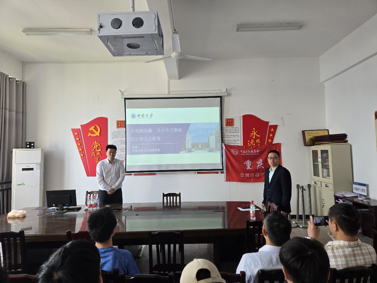2025年4月28日上午9:00-11:00,西南大学陈枫教授受邀到访我校,开展学术交流活动,围绕多核相关熵及其在分布式估计和点云配准中的应用进行专题分享,为校内师生带来一场学术盛宴。该交流活动由冯玉明教授主持,李洪兵教授、张强强博士、姜吴瑾老师以及研究生等约40人参加了交流。