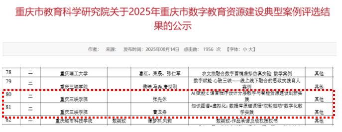 重庆市数字教育资源建设典型案例评选由重庆市教育科学研究院组织,旨在推动数字技术与教育教学深度融合,总结并推广数字教育资源建设的先进经验和创新实践,助力教育高质量发展。本次评选获奖案例数量不超过参评总量的50%,其中一等奖占比10%、二等奖15%、三等奖25%,获奖案例具有较高的代表性和示范价值。